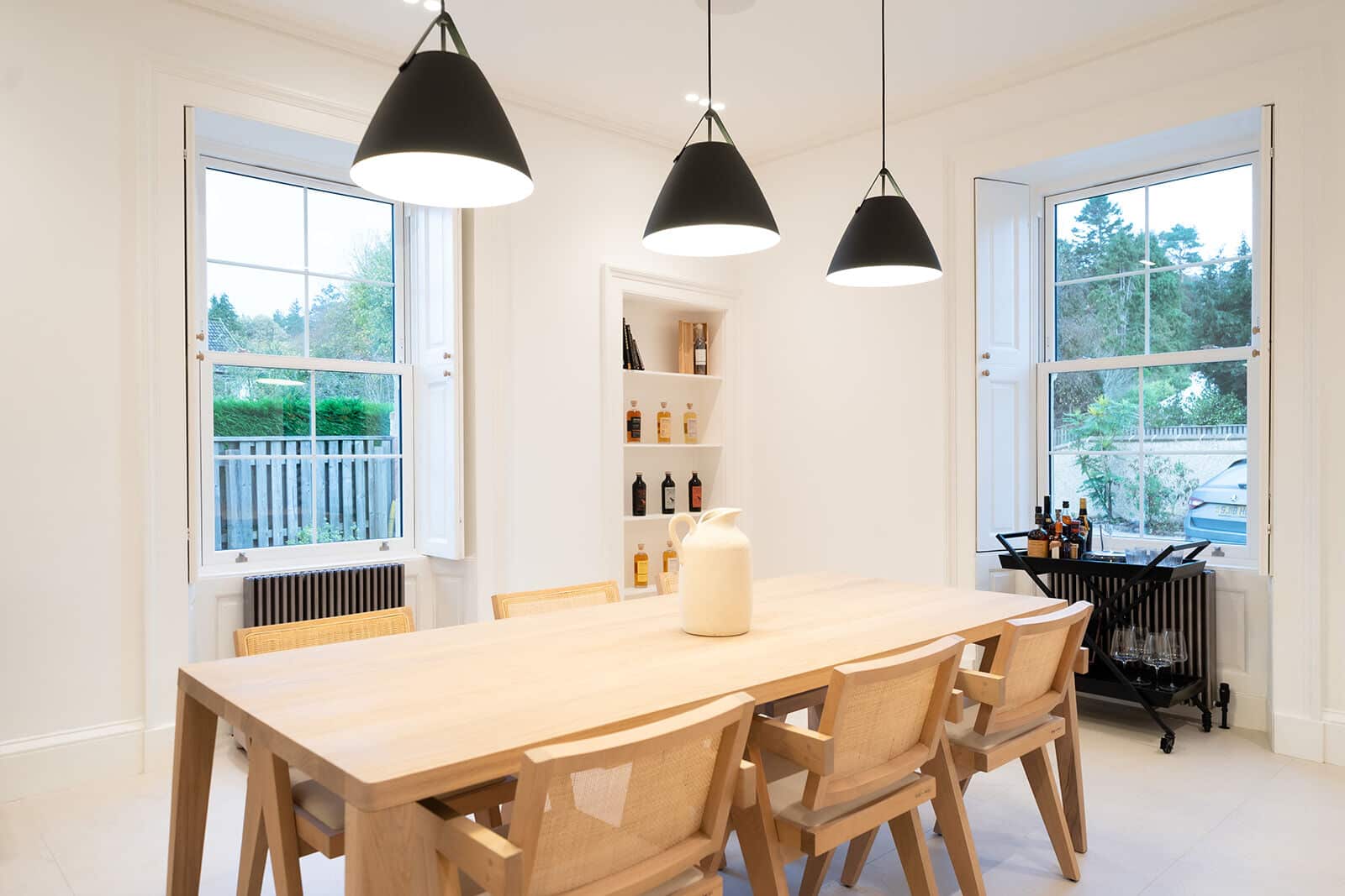 The first is the ever-greater focus on lighting design, which is always an interesting and creative aspect of how a space works and can change the whole feel of a building. Next is that there’s no slow-down in the mid-century modern cabinetry boom, and the third trend is a rise in requests for traditional-style extensions featuring classical design detailing. We’ve also seen more call for LVT surfaces, aka luxury vinyl tiling, which is having a significant moment owing to its ability to accurately mimic more expensive materials like marble and wood. There’s also a call for some beautiful ceiling detailing – we always remind clients to consider ceilings – they can be the source of a key design statement (Sistine chapel, anyone?). And finally, the striking punctuation of black-framed windows are having a renaissance, echoing both industrial design and the traditional Scottish cottage.