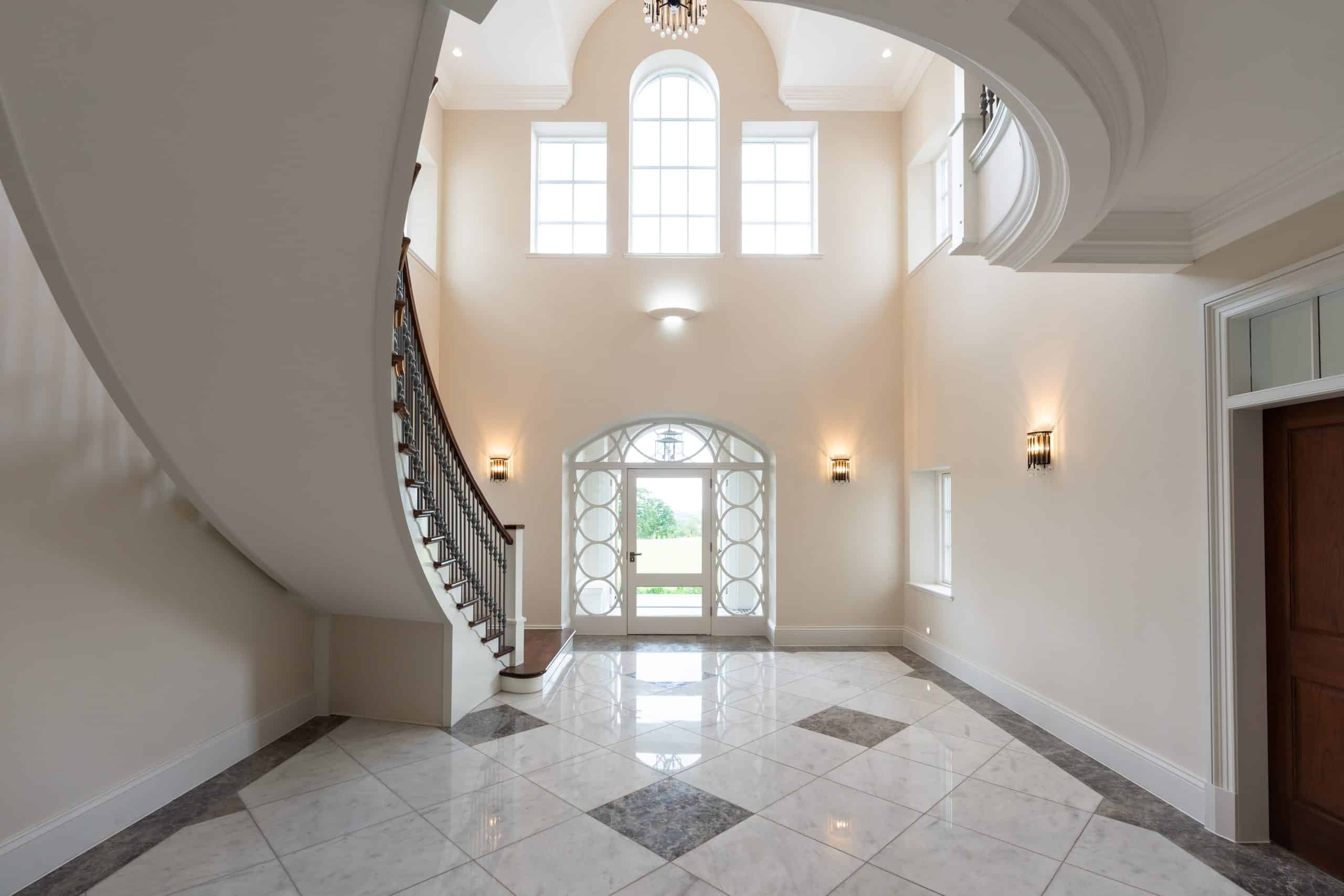 The design is classically symmetrical, with a central entrance and grand hallway and public spaces on either side. Upstairs, the two wings house bedrooms, with the master suite in a central position. The elegant style follows proportions familiar in traditional Scottish architecture, including castle embellishments, and impressive fine detailing throughout.