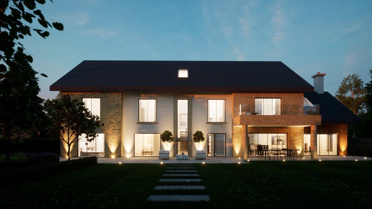 The villa style led us to design a bold, contemporary home, with extensive glazing, high-quality stone, and a balcony, with double-height key rooms and a bright open stairway. The main central part of the house is a 2-storey design, allowing more areas of glass on the first floor which brings in plentiful natural daylight. The side wings are 1 storeys, allowing for a change of proportion, and an open-plan family space with attractive high ceilings. At the rear of the house, the ground-floor rooms all open out onto the garden, generating a feeling of bringing the outside in. Above, the master-bedroom balcony provides shelter to the external dining space, giving a shaded space with minimum effort. This connection between garden and home is great for children to run between house and garden easily, and outdoor dining also becomes very simple to organise. The external materials that we chose also reinforce the idea of the suburban villa style. The house will be finished in an ashlar stone finish and slate roof to give a clean and crisp look.